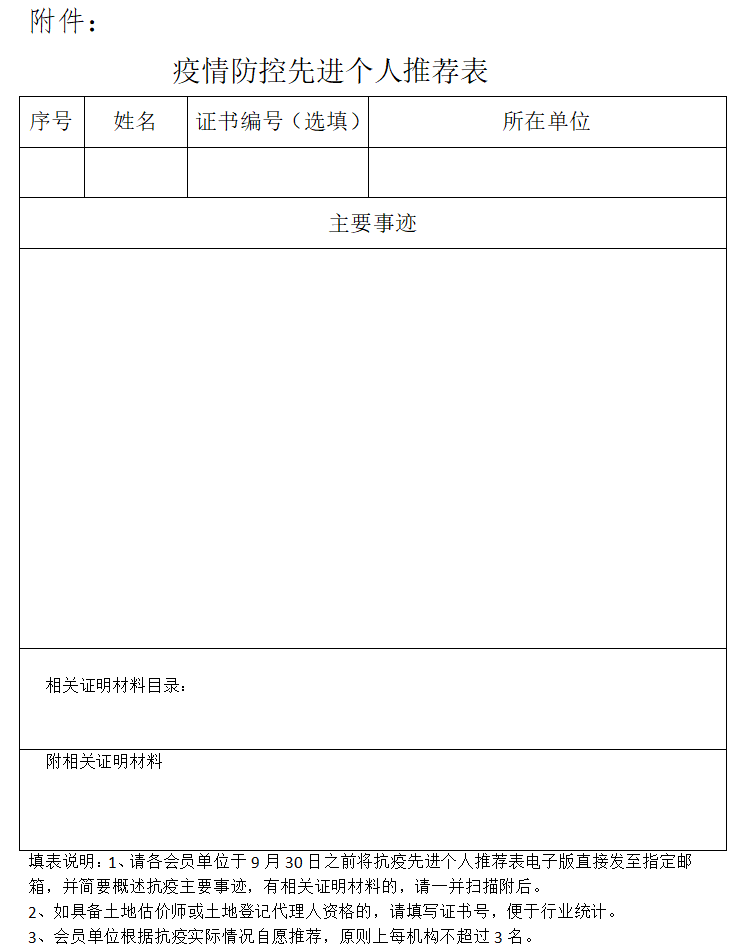 为弘扬先进、凝聚力量,进一步激发全行业社会责任感和使命担当,协会先期已汇总103家疫情防控先进单位情况,现面向土地评估和不动产登记代理会员征集疫情防控先进个人事迹,汇总后将于近期开展行业疫情防控先进单位和先进个人表彰活动。