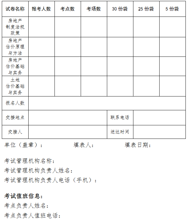 (一)各地考试管理机构根据各科目的报名人数合理预订考试试卷,并确保备用卷数量充足。各地的试卷数量由全国房地产估价师职业资格考试办公室根据各地考试管理机构上报的试卷预订单核发,于2021年11月12日前由专人将试卷送达指定的交接地点。
