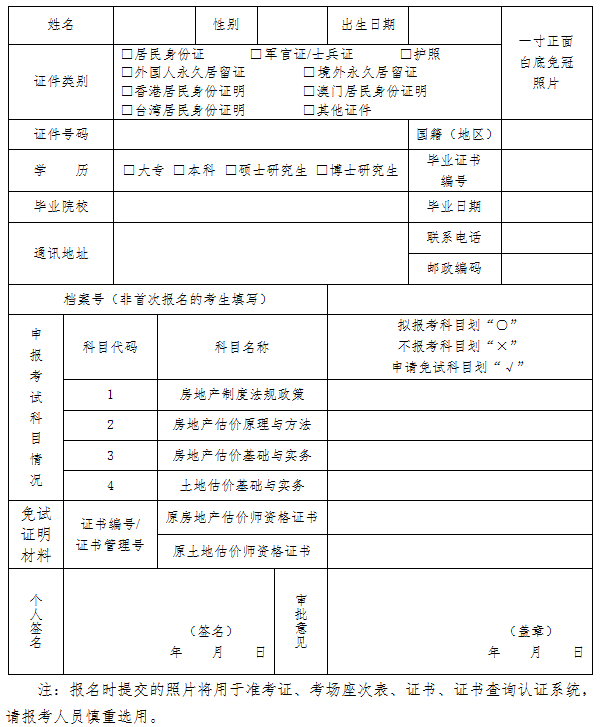2021年度房地产估价师考试报名申请表