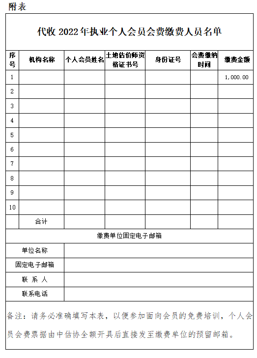 根据相关授权委托书,中国土地估价师与土地登记代理人协会(以下简称“中估协”)授权我会代为收取2022年度执业土地估价师个人会员会费,标准为1000元/年,请各机构根据土地估价机构备案系统中备案土地估价师人数将2022年个人会费全额缴纳至省协会,省协会将统一汇转至中估协。