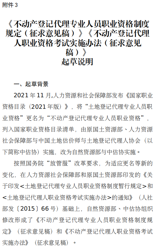 根据国家职业资格改革工作要求,我部起草了《不动产登记代理专业人员职业资格制度规定(征求意见稿)》《不动产登记代理人职业资格考试实施办法(征求意见稿)》,现征求你们意见,请于2022年3月20日前将相关意见反馈自然资源确权登记局。