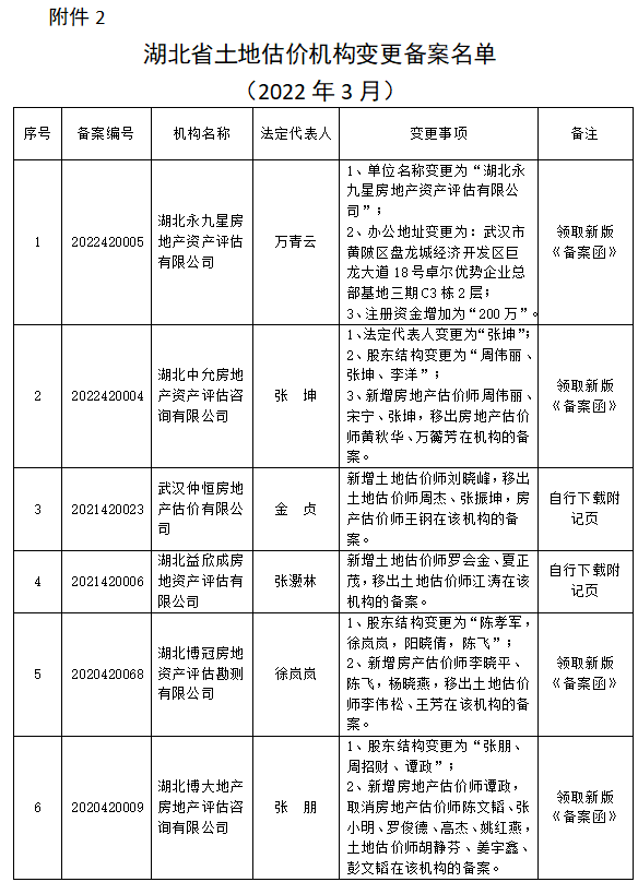 2.湖北省土地估价机构变更备案名单(2022年3月)