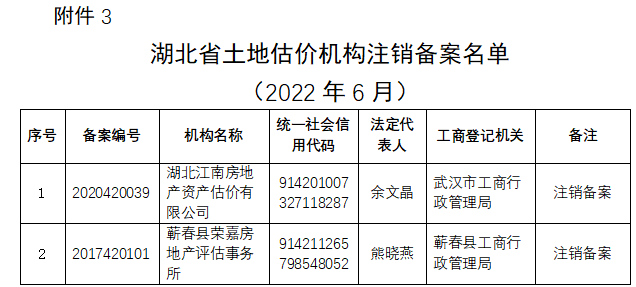 3.湖北省土地估价机构注销备案名单(2022年6月)