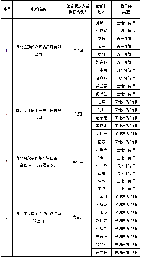 根据《湖北省土地估价与登记代理协会章程》,经机构自愿申请,协会秘书处受理,会员会籍委员会审查,并经书面征求常务理事会同意,现对符合《湖北省土地估价师协会入会及会员会籍管理办法》条件的4家土地估价机构吸纳入会,现公示如下,如有异议请于一周内联系省协会(027-87830535 俞蓉)